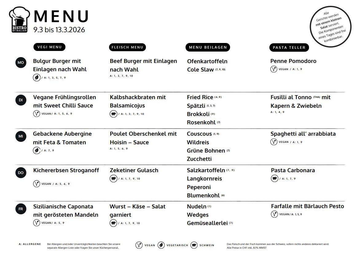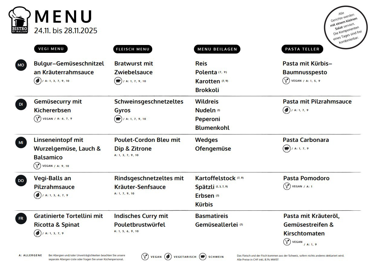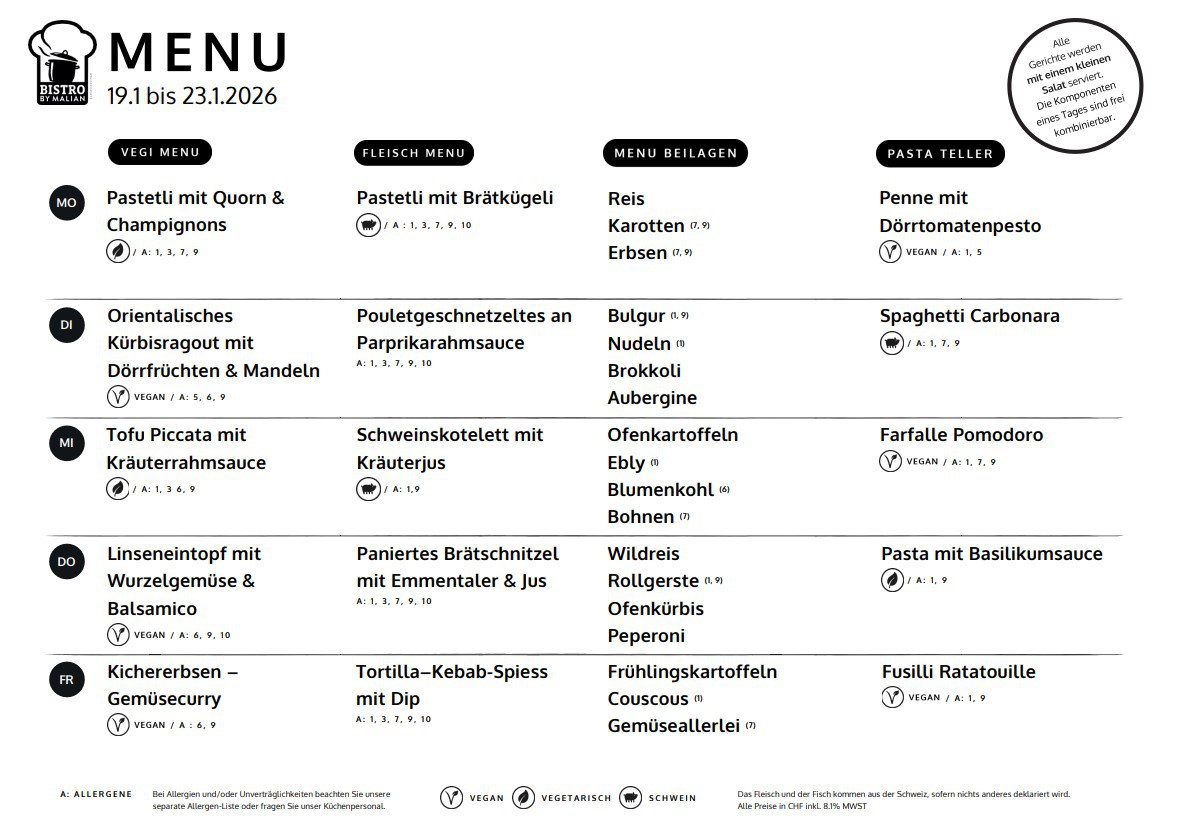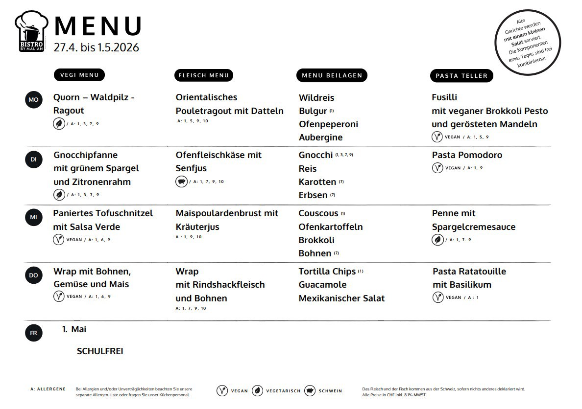 Täglich frisch, täglich gesund, täglich anders – das ist unser Motto. Unsere Vielfalt an Angeboten laden herzlich ein zum Geniessen. Wir arbeiten soweit es geht mit lokalen Händlern und Produkten, um die Transportwege so kurz wie möglich zu halten. Uns ist es ein grosses Anliegen, unseren Gästen eine ausgewogene und abwechslungsreiche Mahlzeit anbieten zu können.
