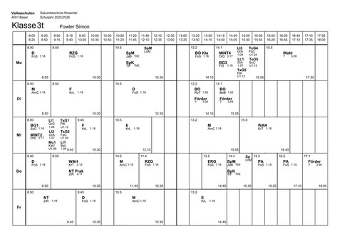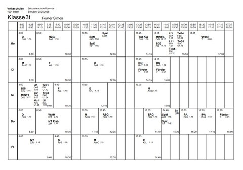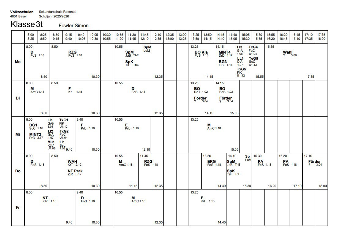 Klassenlehrperson: Simon Fowlersimon.fowler@edubs.chKlassenzimmer. 1.18Stundenplan